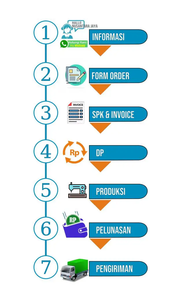 Order Instruction Cara Pemesanan Barang Konsultasi: Hubungi kami via WA/website untuk info harga, jenis kain, dan waktu produksi.Pilih Desain: Pilih dari katalog kami atau kirim desain sendiri.Konfirmasi Pesanan: Setujui desain, jumlah, ukuran, dan jenis kain.Estimasi & DP: Kami kirim estimasi biaya, lalu Anda bayar DP 50%.Produksi: Proses produksi 15–30 hari kerja. Kami berikan update secara berkala.Pelunasan & Pengiriman: Setelah jadi, Anda lunasi dan pesanan kami kirimkan.Garansi: Periksa barang saat diterima. Ada cacat? Klaim garansi dalam 7 hari. Simple Order Proses Cepat Hasil Memuaskan Hubungi Kami: Chat WhatsApp Kembali ke Halaman Muka